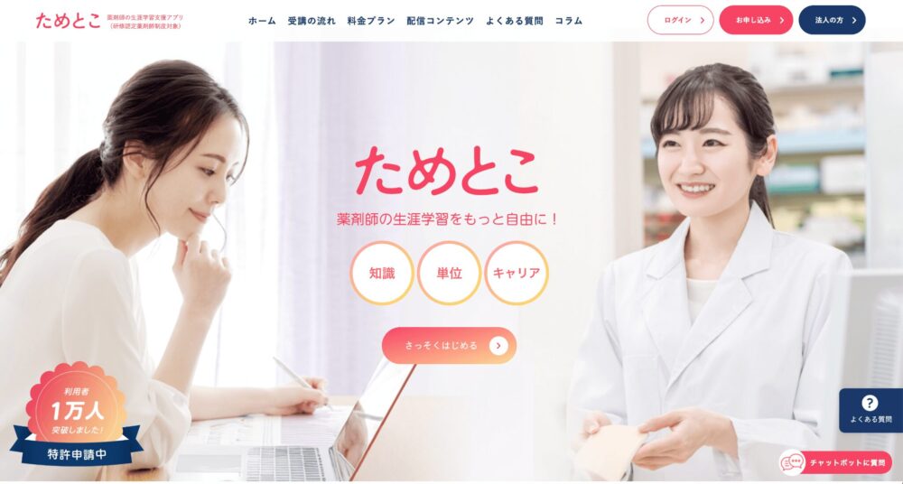 ためとこは、薬剤師の生涯学習を支援するための学習アプリです。「研修認定薬剤師」の単位取得と申請が1つのアプリ内で完結します。
