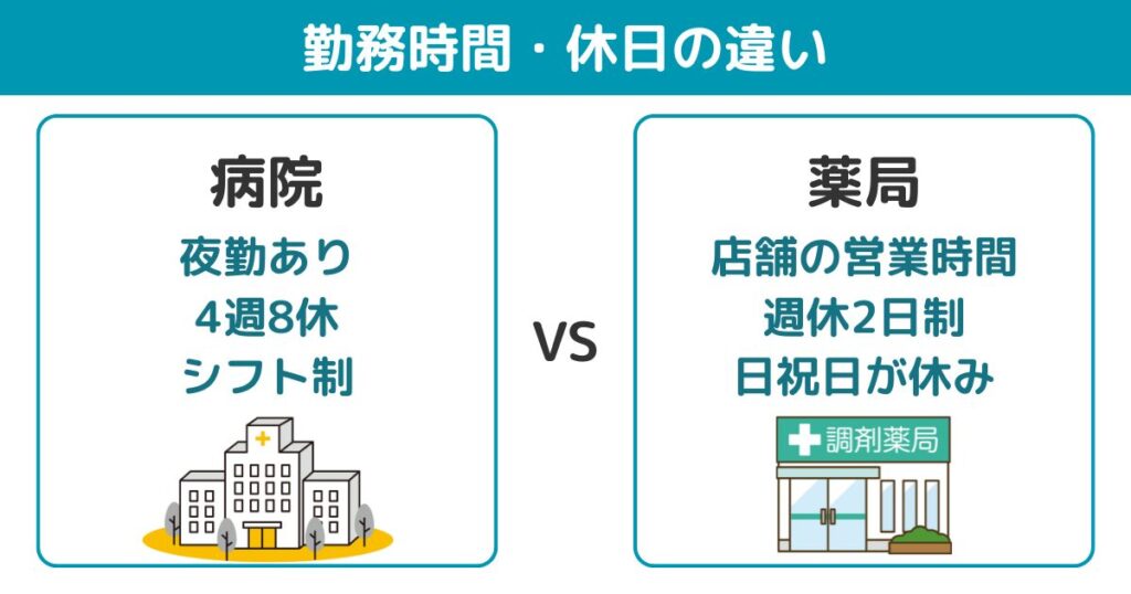 調剤薬局は夜勤がなく、店舗の営業時間に準じた安定した勤務時間で、ワークライフバランスを保ちやすい傾向があります。