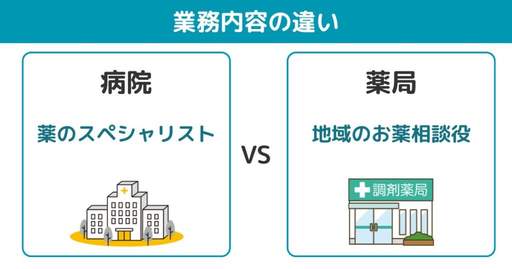 病院薬剤師と薬局薬剤師、どちらも調剤業務がある点は共通しています。ここでは、それぞれの業務内容の異なる点を解説します。